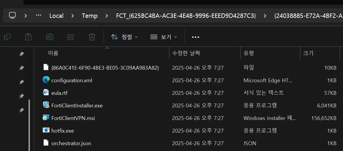 Fortinet 커뮤니티 포럼을 검색하던 중 비슷한 문제를 겪은 사용자들의 해결책을 발견했습니다. 다행히도 설치 파일이 임시 폴더에 이미 추출되어 있어 직접 MSI 파일을 이용해 설치할 수 있었습니다.