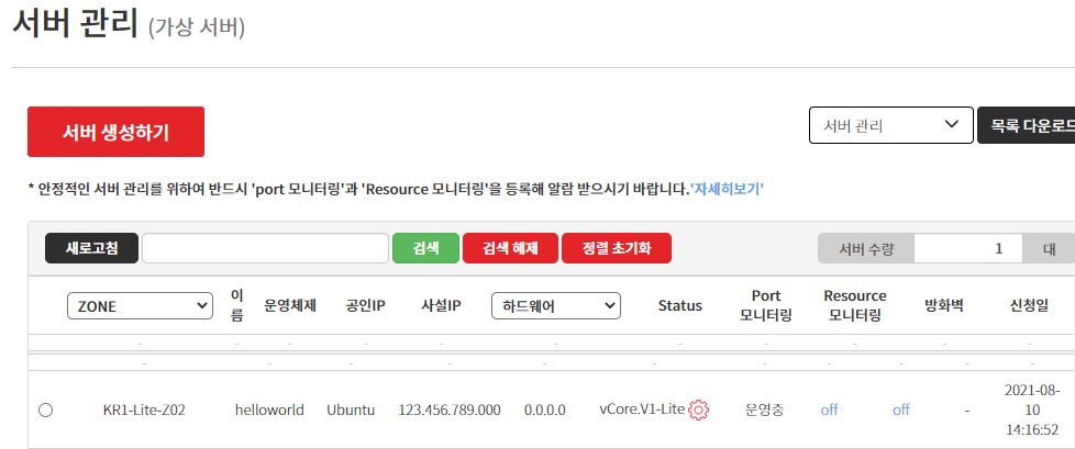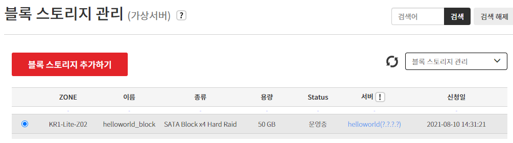 기본으로 vm-lite (ubuntu 20버전) 과 blockstorage(예제로50GB) 생성